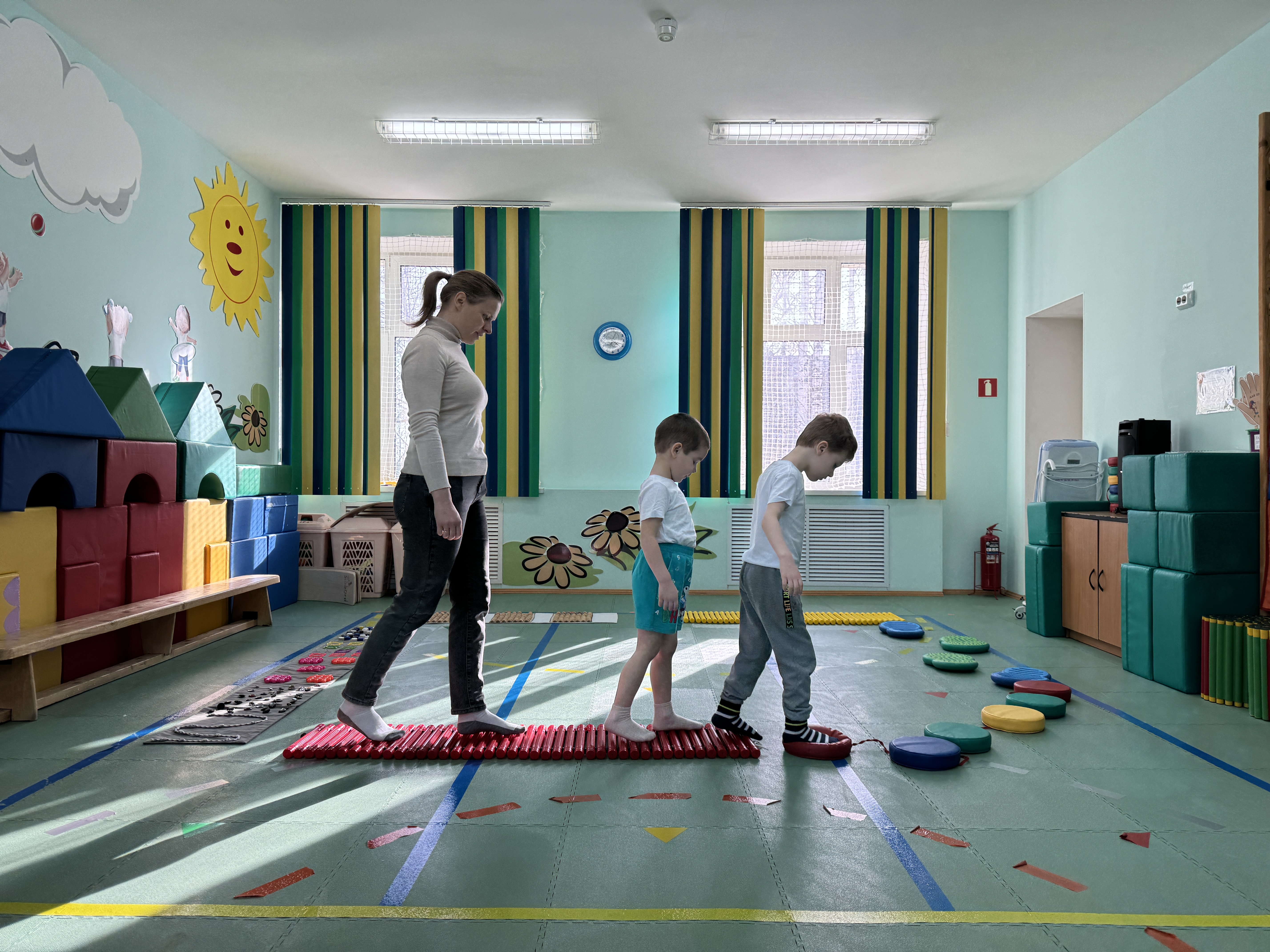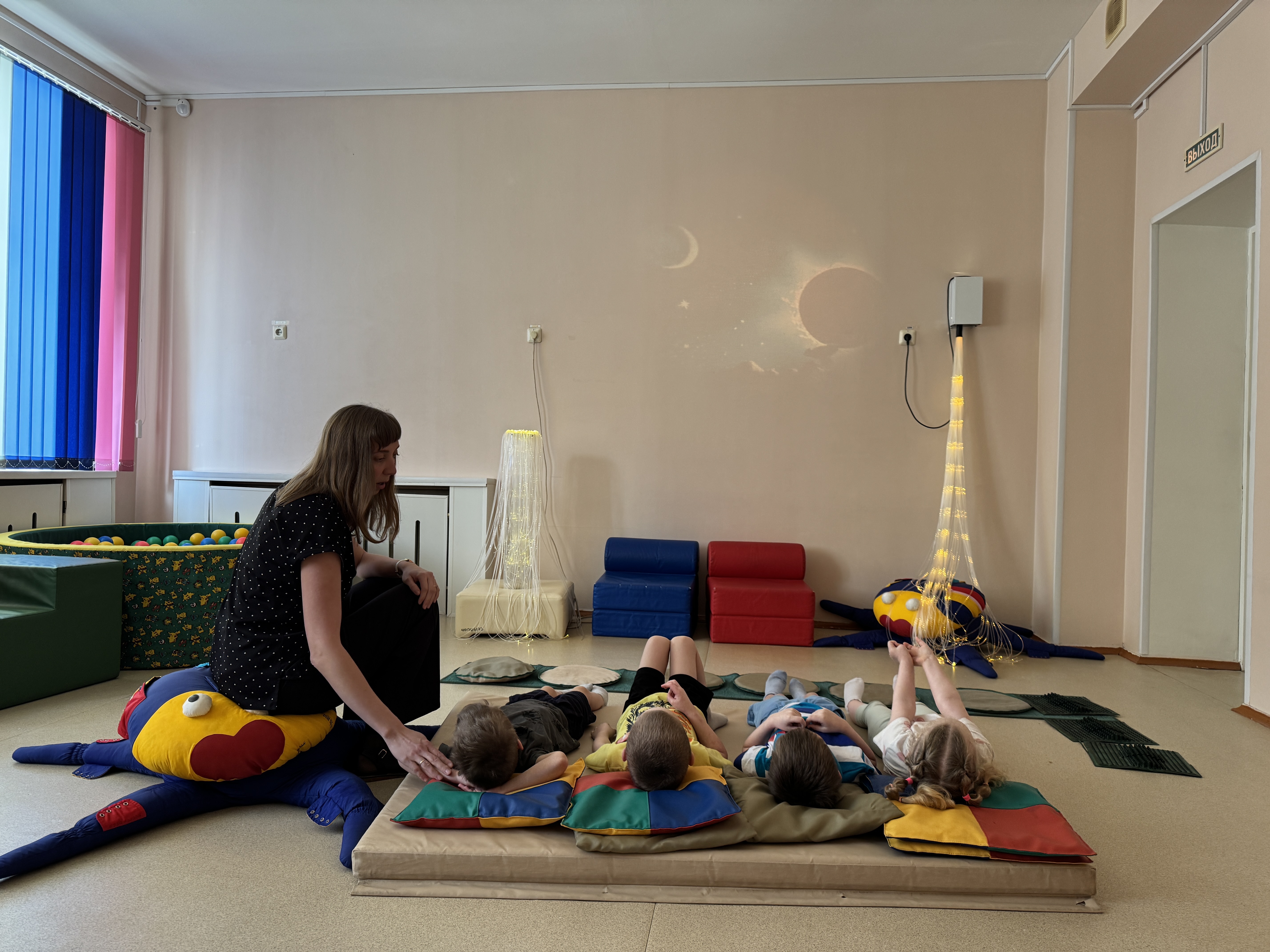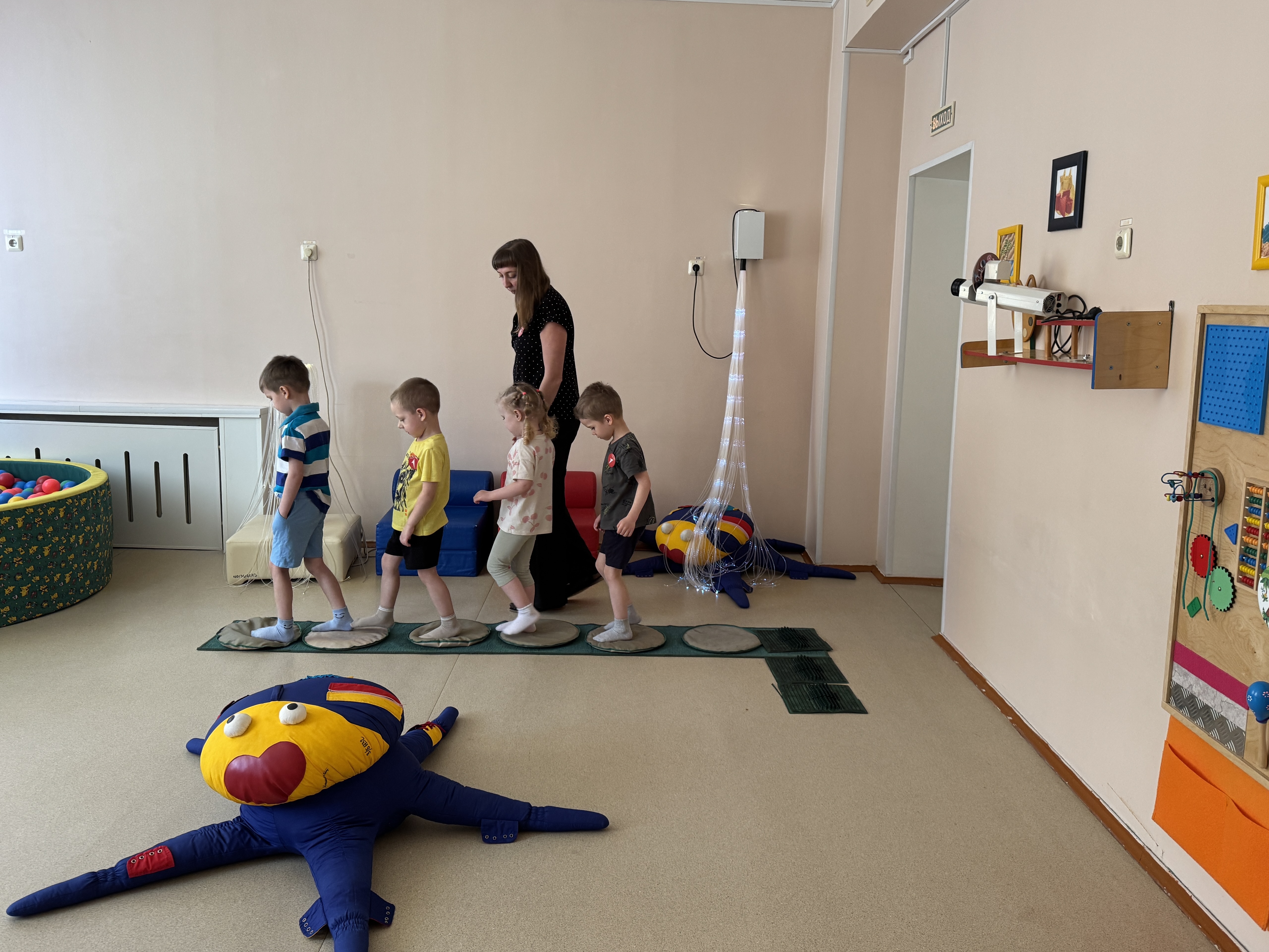 - В группе «Светофорик» мы применили дорожку для тактильного восприятия, которая помогает детям лучше понимать и контролировать свое тело; поиграли в игры, направленные на здоровый образ жизни, где воспитанники узнали о полезных и вредных продуктах; провели «космическую релаксацию».