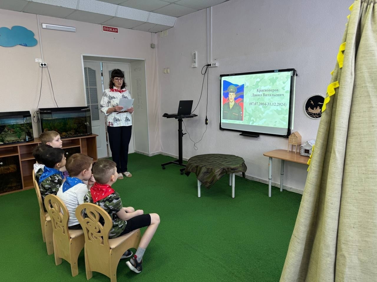 В группе «Мальвина» прошло мероприятие «Герои СВО-наши земляки». Наставник - Лаврова И.В. рассказала детям о подвигах наших урайских участников специальной военной операции: