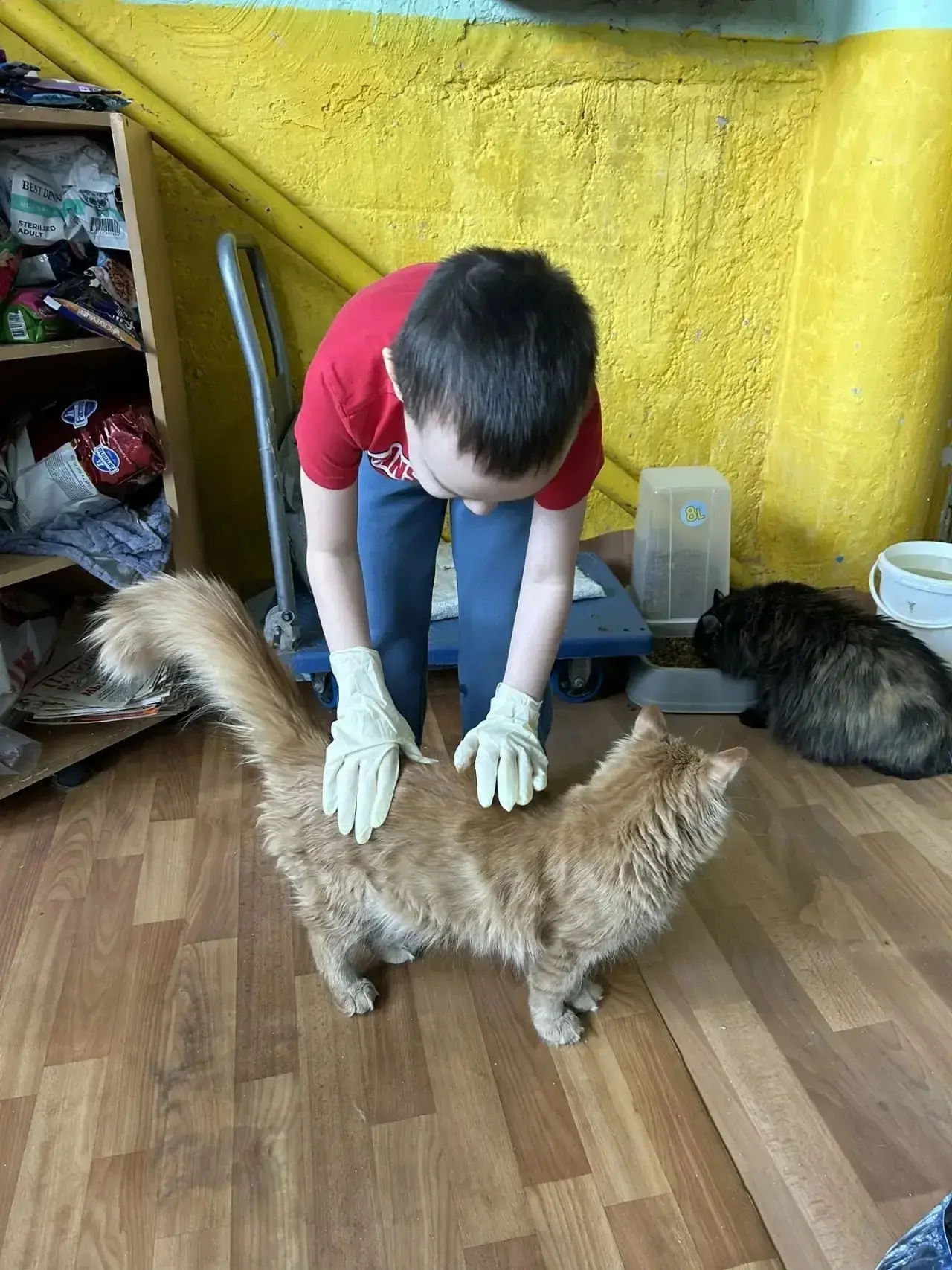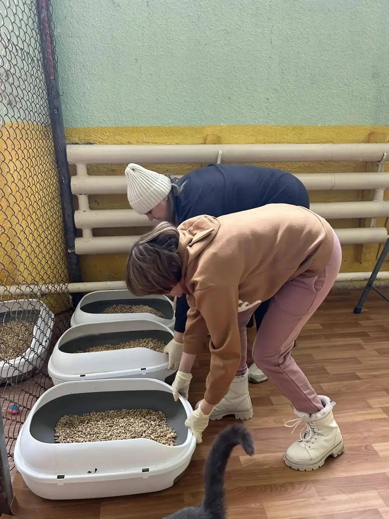 Наши самые ответственные наставники взяли на себя непростую, но очень важную задачу - чистку лотков. Другие команды с энтузиазмом взялись за влажную уборку, чтобы в «Кошкином доме» стало еще светлее и приятнее. А для самых нежных и заботливых была приготовлена самая приятная миссия – кормление наших усатых друзей!